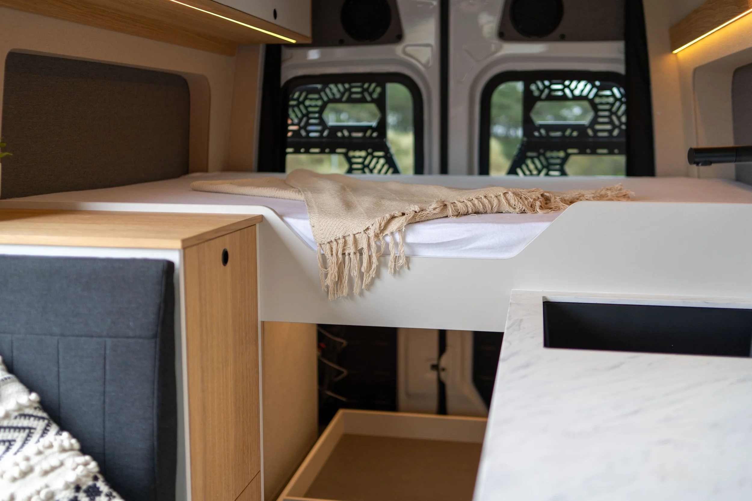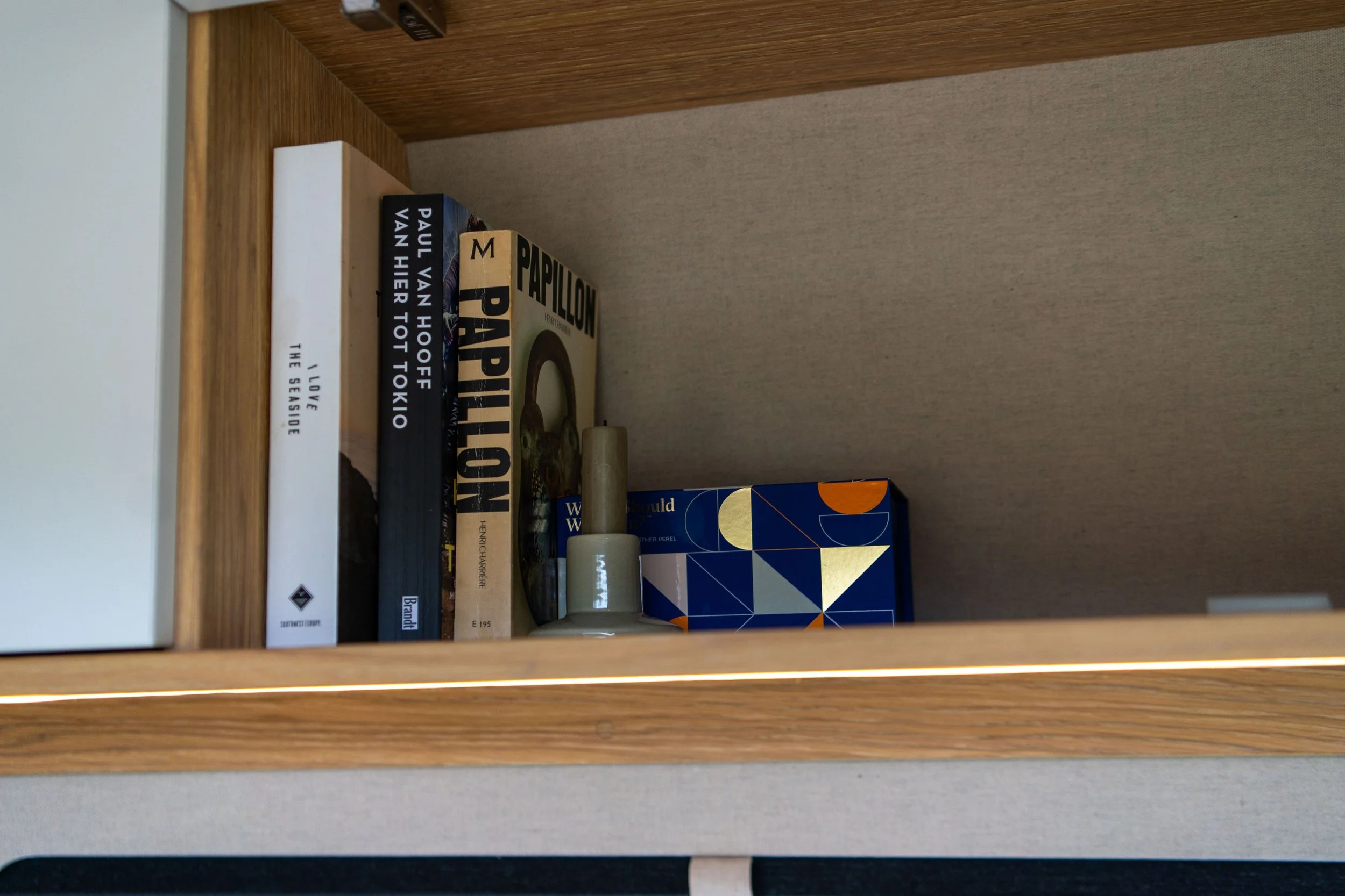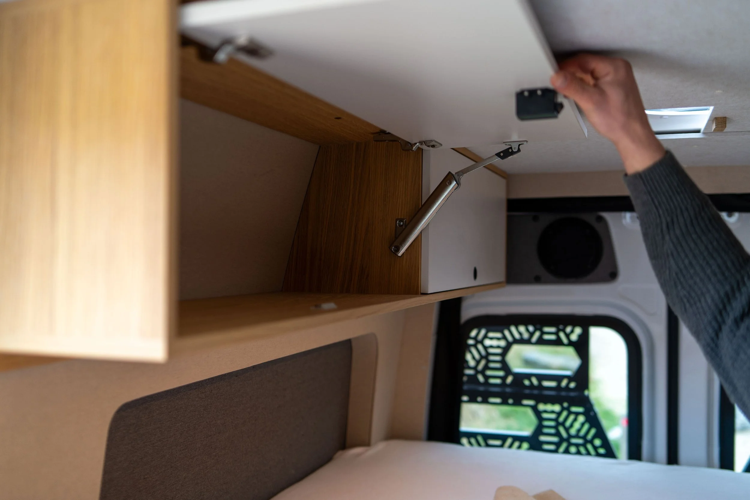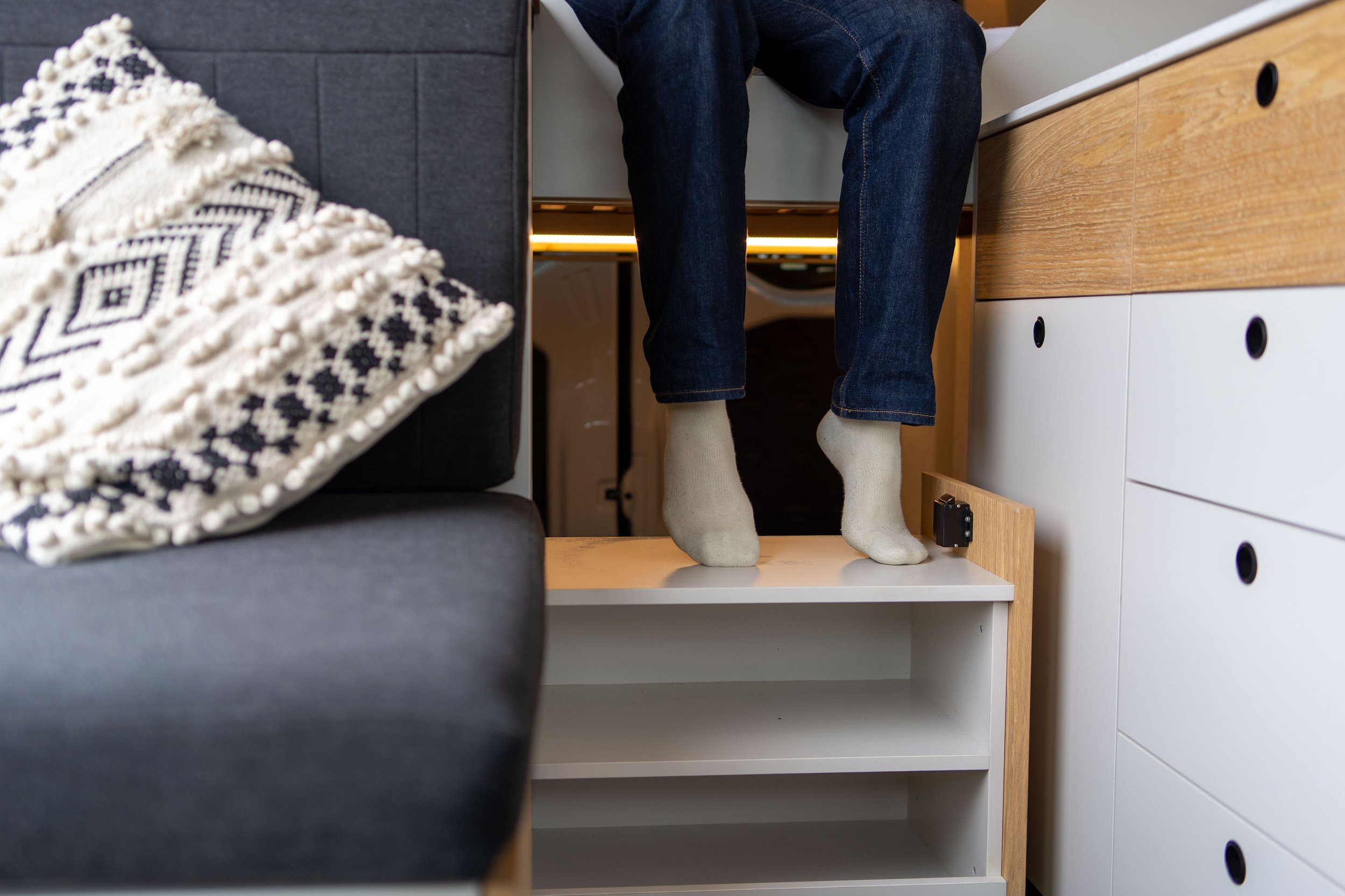 Een indeling die sterk gebaseerd is op ons vorige project, Semi #5, maar opnieuw voorzien van diverse kleine verbeteringen. Zo is de opstap naar het bed praktischer en veiliger gemaakt en is de kast achter het zitje vergroot, waardoor ook in deze camper aan opbergruimte geen gebrek is.