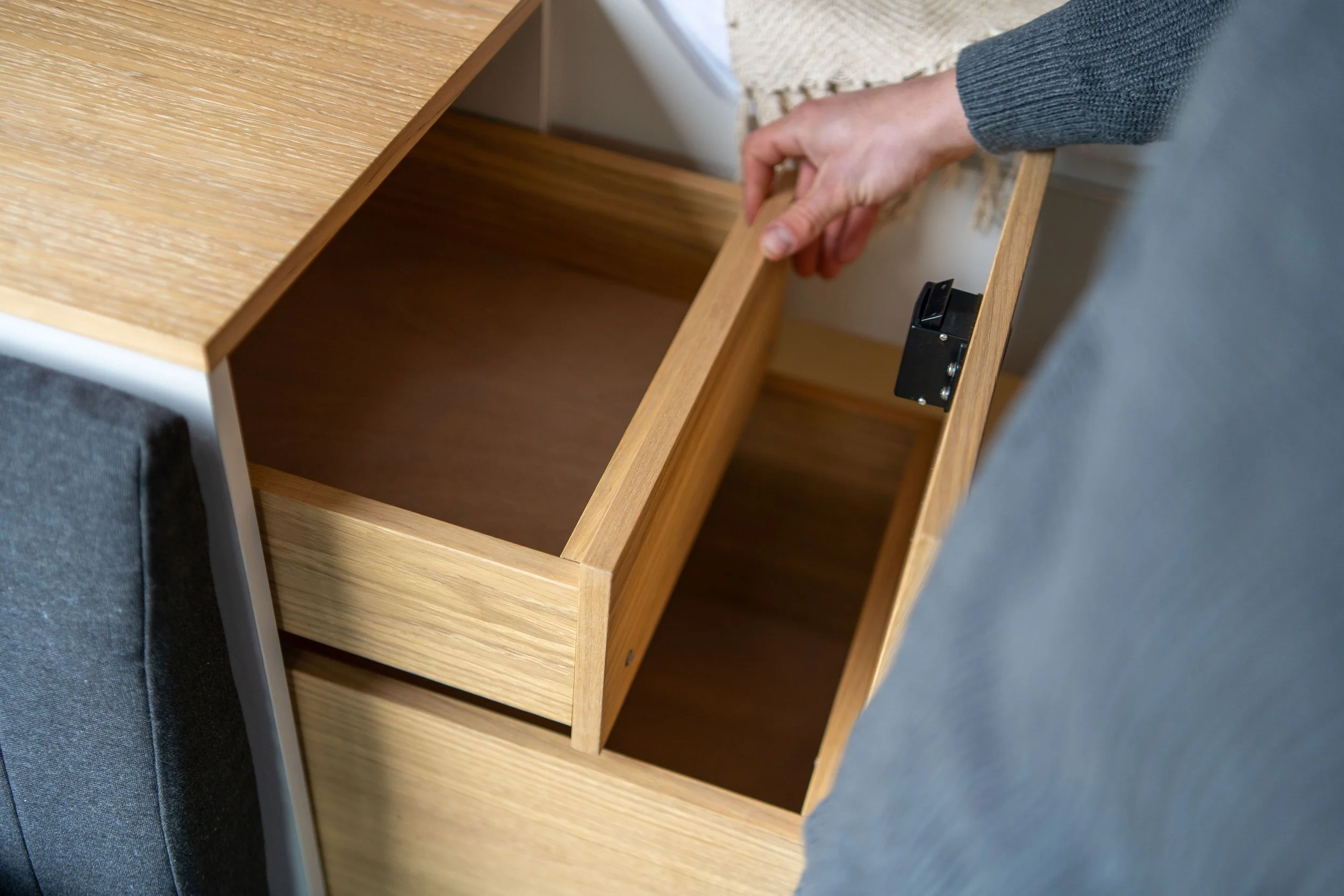 Eiken houtfineerafwerking voor o.a. de bovenkasten en de kast achter het zitje.
